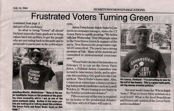 Mike DeRosa is running for state senator in the 1st District (Hartford & Wethersfield). "We have over 2000 people on the mailing list. In 1996 we received 24,400 signatures supporting Nader for president. This year we can do much better." DeRosa concedes that it will be an uphill battle but returns to the Green Party's theme, "Voters are using the arrgument that they are voting for the lesser of two evils. They are really voting for the evil of two lessers." Apparently voters in the Nutmeg State are beginning to agree. Hartford recently elected Elizabeth Horton Sheff, a Green Party |